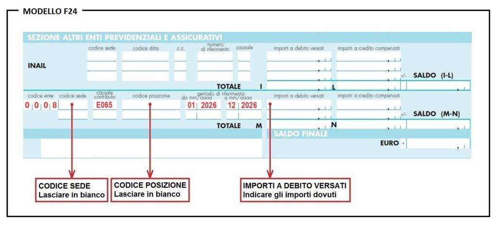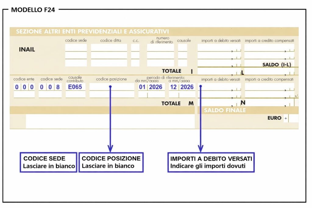 Il modello F24 è quello ordinario. Nell’ultima sezione in basso – Altri Enti Previdenziali ed Assicurativi – al di sotto della parte riservata all’INAIL, devi inserire i seguenti dati: